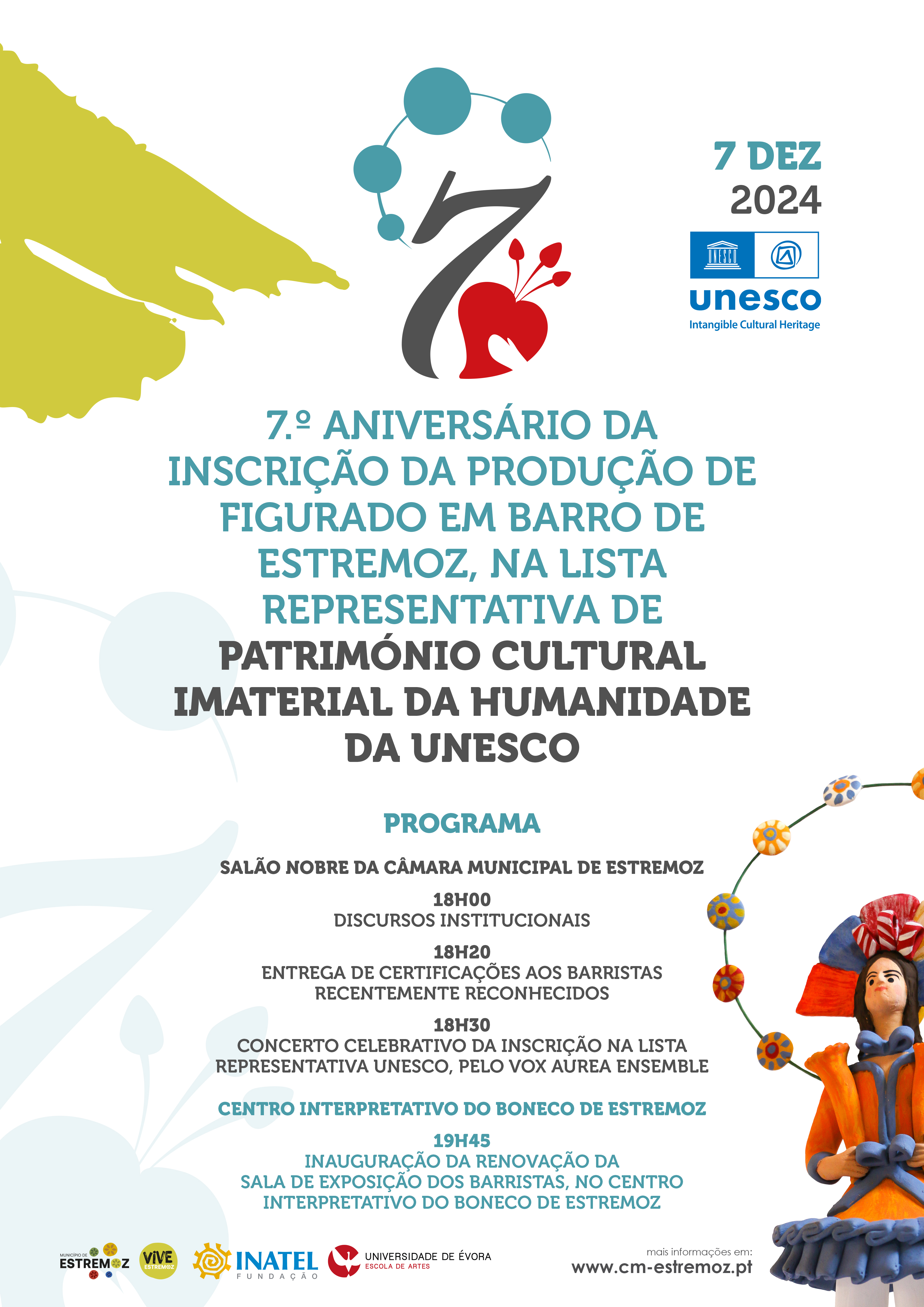 No sábado, dia 7 de dezembro de 2024, comemora-se o 7.º aniversário da Inscrição da Produção de Figurado em Barro de Estremoz, na Lista Representativa de Património Cultural Imaterial da Humanidade da UNESCO.