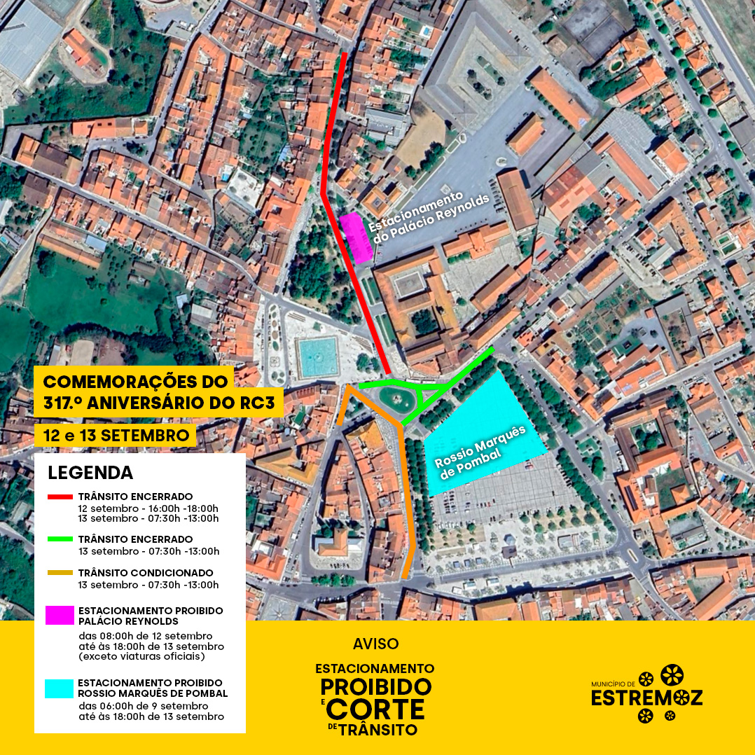 O Município de Estremoz informa toda a população que, em virtude das Comemorações do 317.º Aniversário do RC3, haverá condicionamentos de trânsito, de acordo com a Planta: