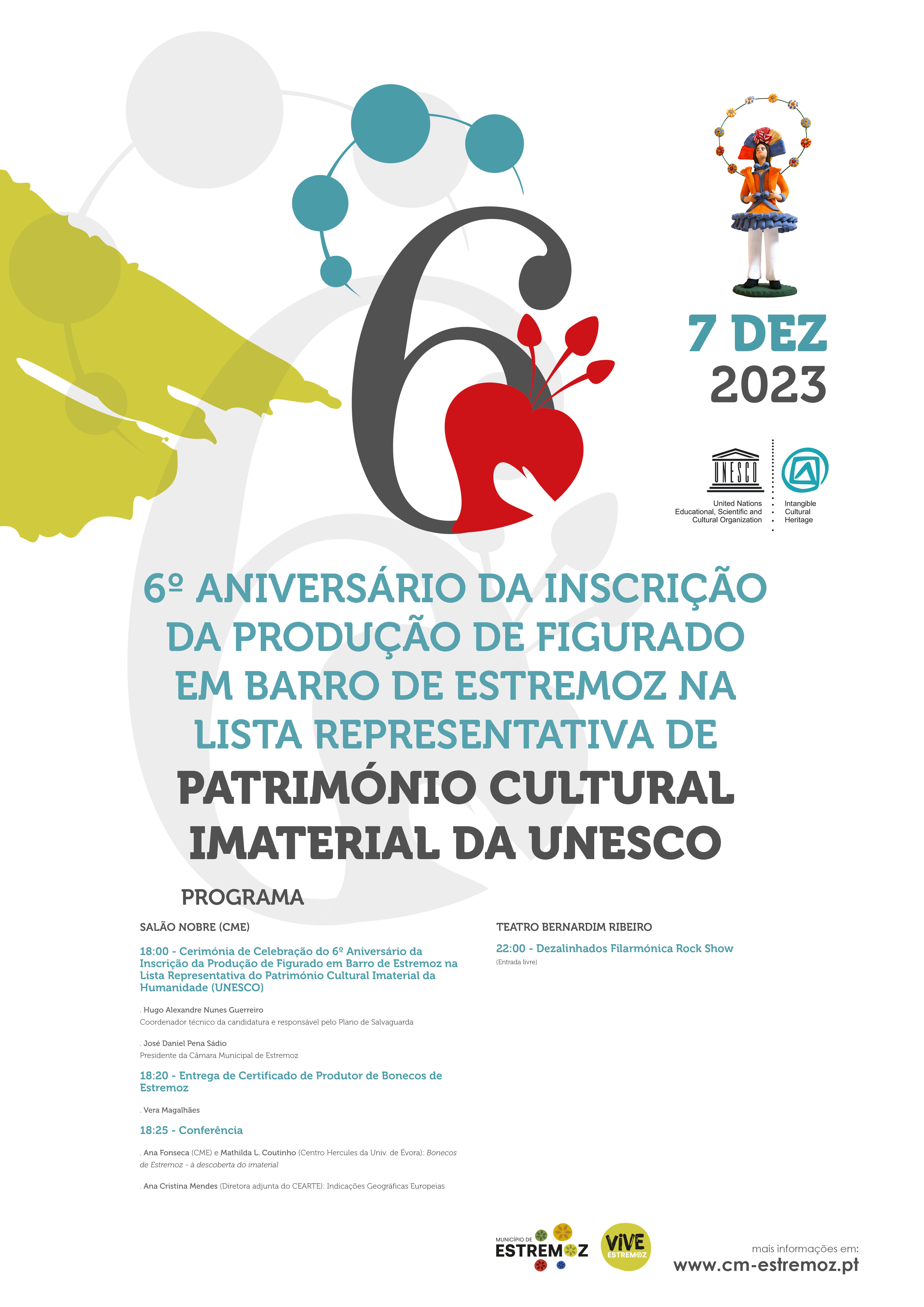 O Município de Estremoz irá comemorar o 6.º aniversário da inscrição da Produção de Figurado em Barro de Estremoz na Lista Representativa de Património Cultural Imaterial da UNESCO", no dia 7 de dezembro de 2023, com o seguinte programa: