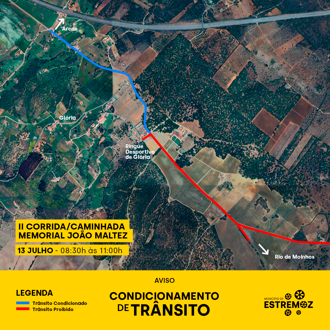 O Município de Estremoz informa que, dia 13 de julho, realiza-se-à a II Corrida/Caminhada Memorial João Maltez e estarão condicionadas as seguintes estradas: