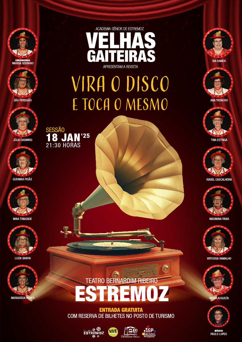 As "Velhas Gaiteiras", da Academia Sénior de Estremoz, sobem ao palco do Teatro Bernardim Ribeiro, em Estremoz, para o espectáculo de encerramento da tournée da Revista à Portuguesa "Vira o Disco e Toca Mesmo", no dia 18 de janeiro (sábado), pelas 21:30 horas.