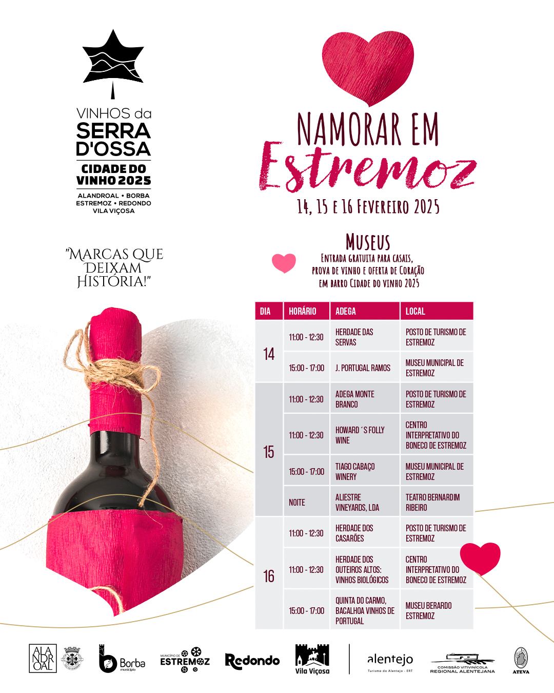 A entrada nos Museus é gratuita, para casais, e além da prova de vinhos recebem também, os 25 primeiros casais visitantes, um coração em barro Cidade do Vinho 2025.