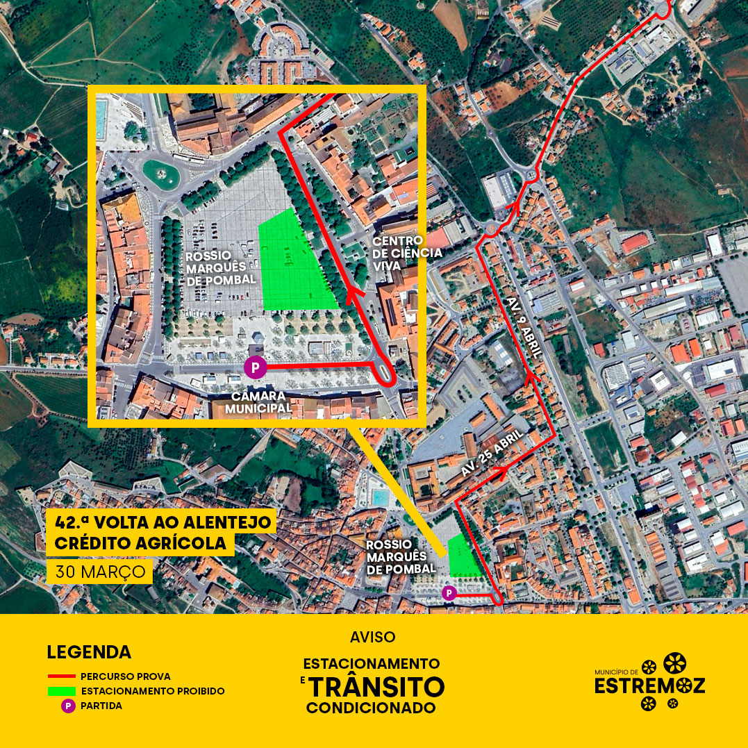 No âmbito da realização da 5.ª etapa da 42.ª Volta ao Alentejo, informamos que o trânsito estará interrompido, na zona do Rossio Marquês de Pombal, conforme imagem, em frente à Câmara Municipal de Estremoz, entre as 20:00 horas de sábado, dia 29 de março e as 14:00 horas de domingo, dia 30 de março.