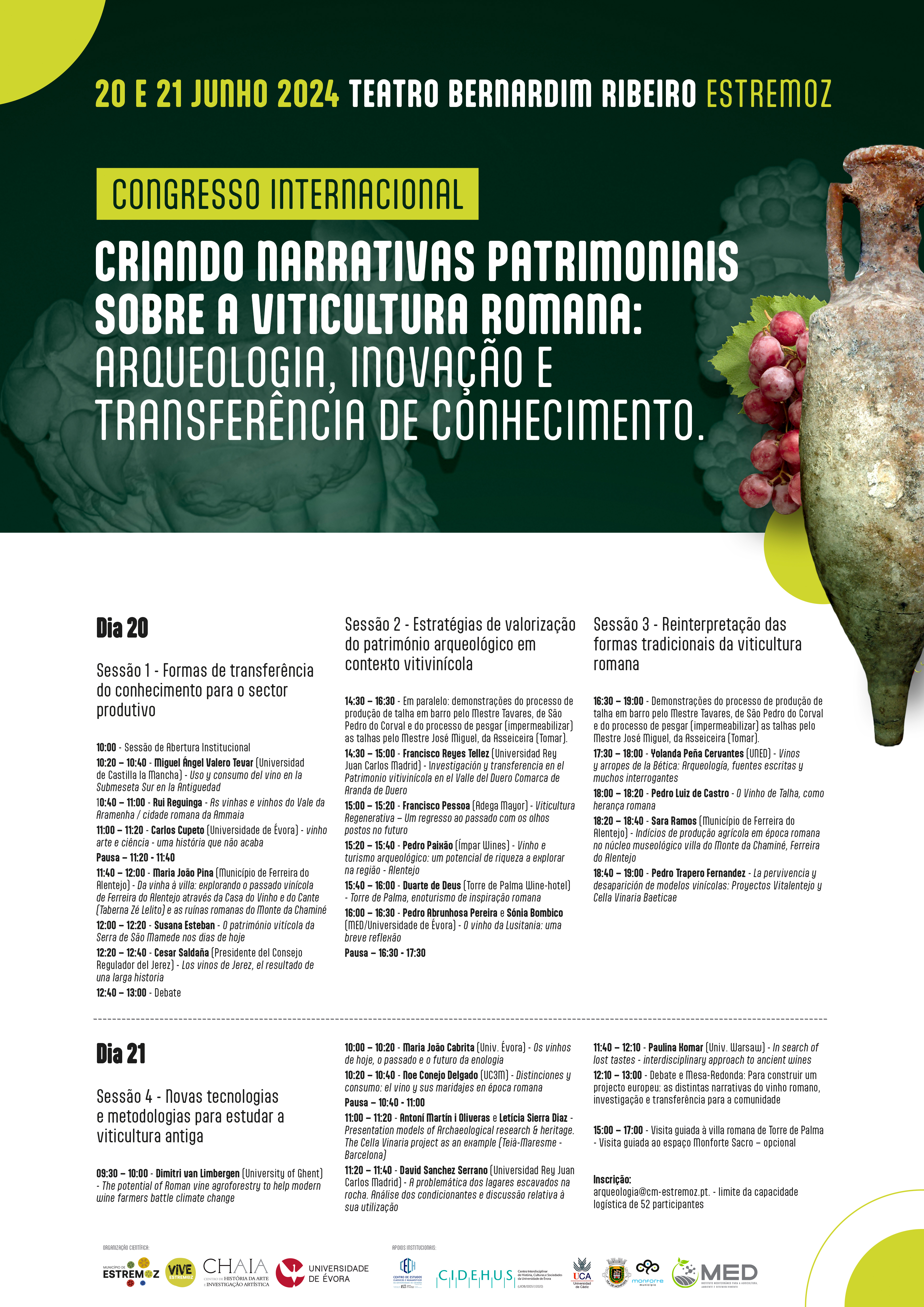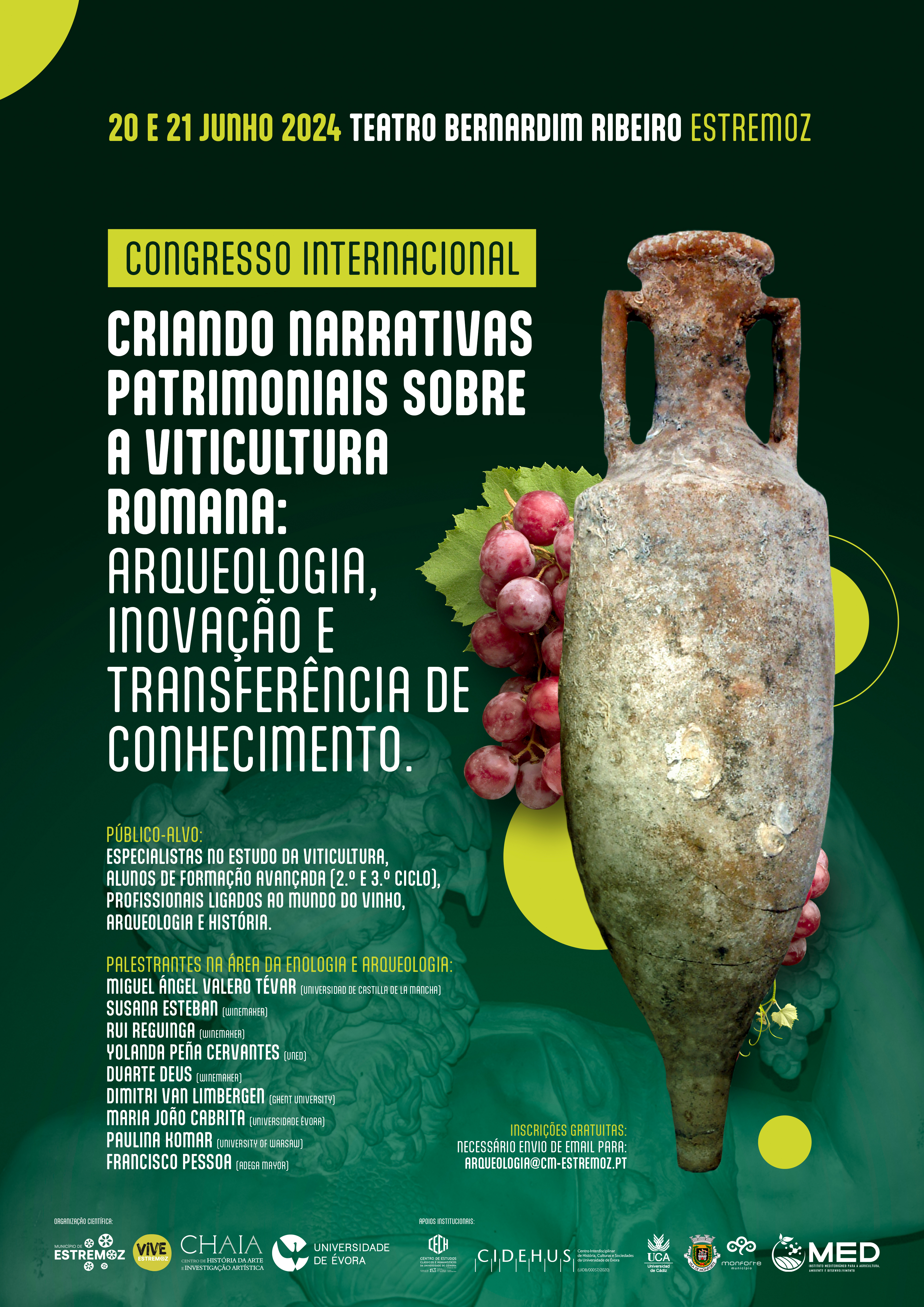 O Congresso Internacional “Criando narrativas patrimoniais sobre a viticultura romana: Arqueologia, Inovação e Transferência de Conhecimento” irá decorrer em Estremoz, nos dias 20 e 21 de junho, no Teatro Bernardim Ribeiro.