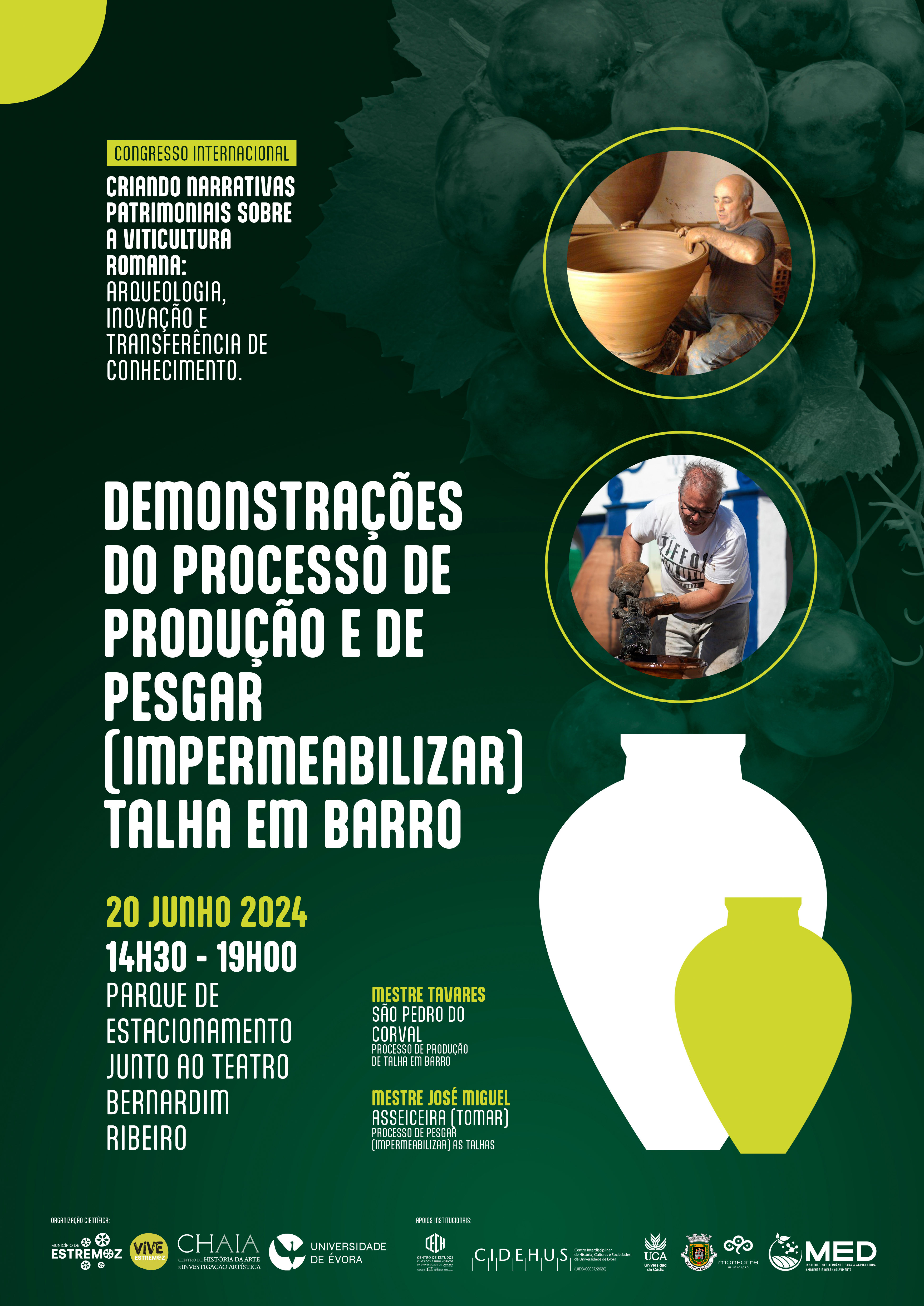 No dia 20 de junho, a partir das 14h30, no parque de estacionamento junto ao Teatro Bernardim Ribeiro, poderá assistir também às demonstrações de dois processos ancestrais: a produção de talha em barro pelo Mestre Tavares de São Pedro do Corval e do processo de pesgar (impermeabilizar) as talhas pelo Mestre José Miguel da Asseiceira (Tomar).