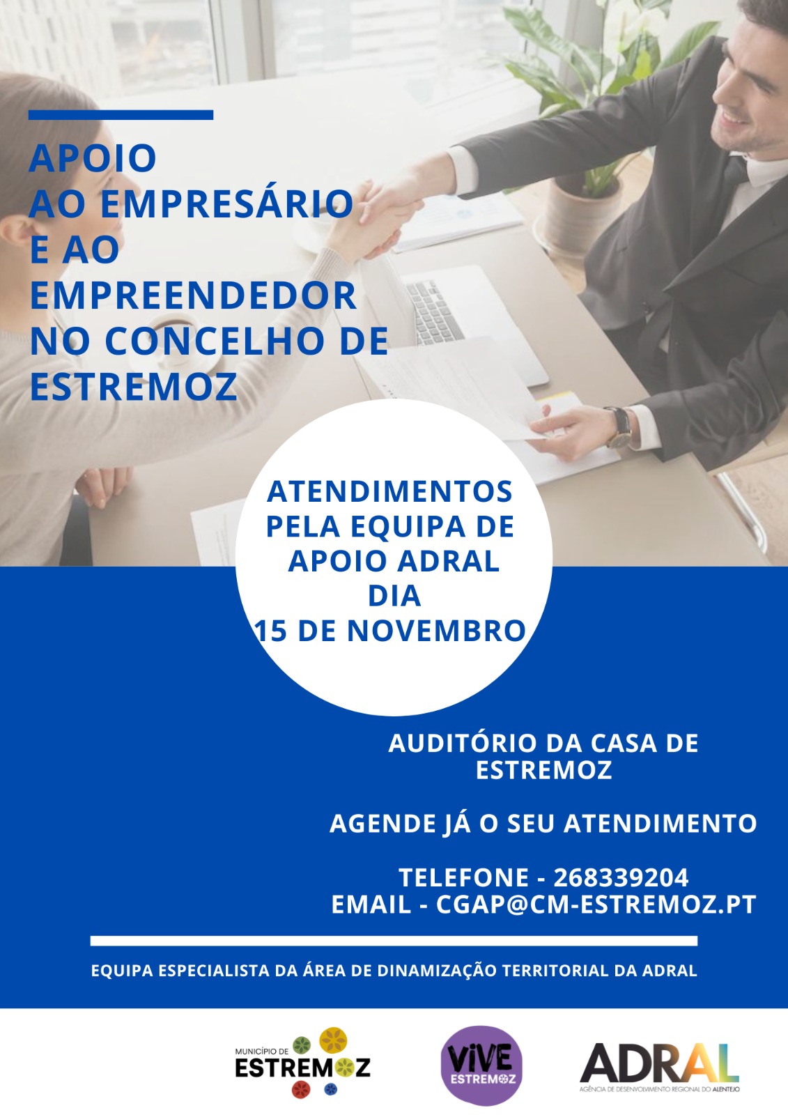 Os atendimentos serão feitos pela Equipa de Apoio ADRAL. Agende o seu atendimento, através do número 268339204 ou do email cgap@cm-estremoz.pt.