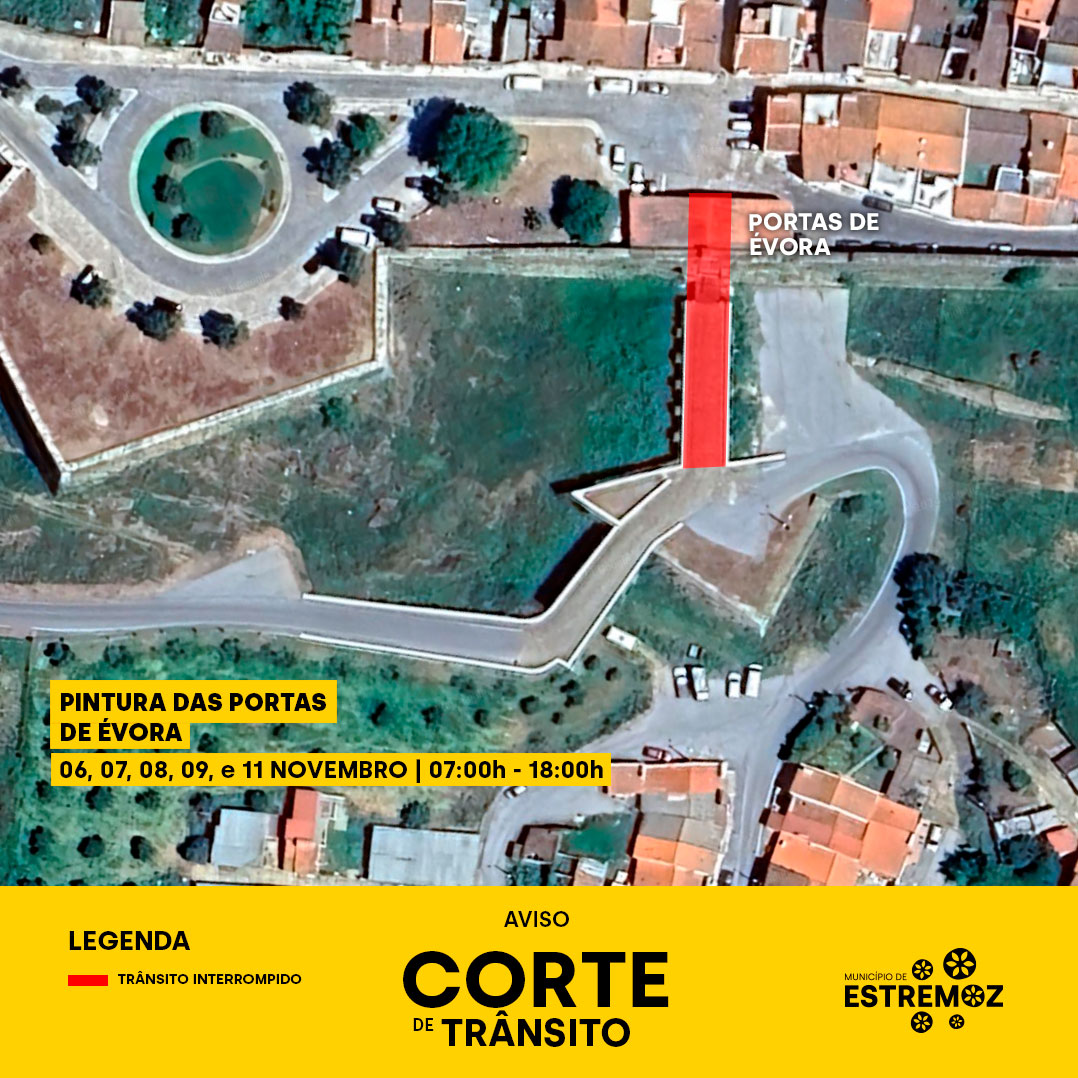 O Município de Estremoz informa toda a população, em virtude das Pinturas das Portas da Cidade, do seguinte corte de trânsito: