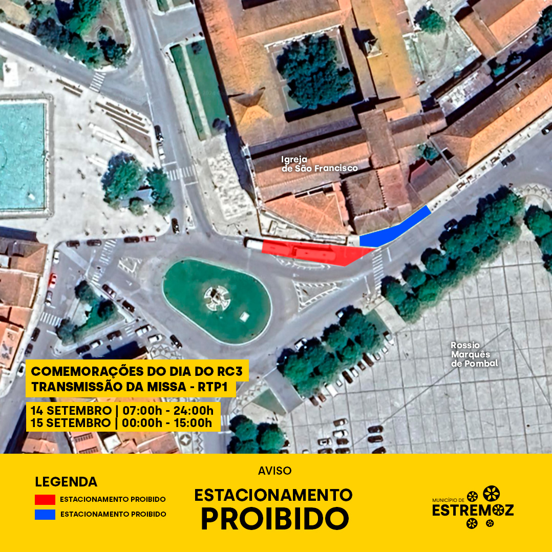 Desta forma, para dar resposta às necessidades logísticas desta transmissão, informa-se que que os espaços assinalados a vermelho e a azul, na imagem, encontrar-se-ão interditos a estacionamento desde as 07:00 horas de amanhã, dia 14 de setembro, até às 15:00 horas, de domingo, dia 15 de setembro.