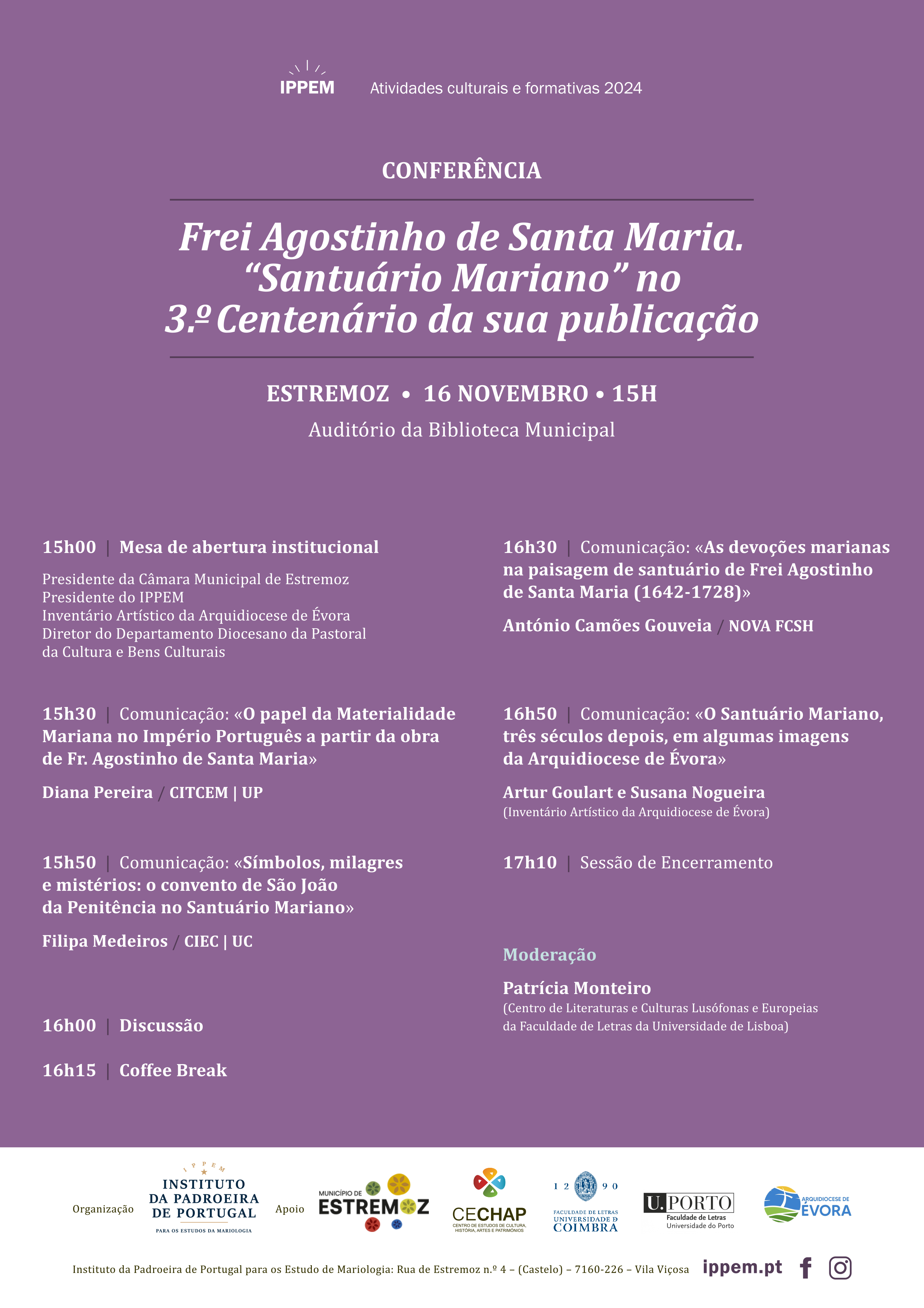 O Auditório da Biblioteca Municipal irá receber, dia 16 de novembro, pelas 15:00 horas, a conferência Frei Agostinho de Santa Maria. "Santuário Mariano" no 3.º Centenário da sua publicação.