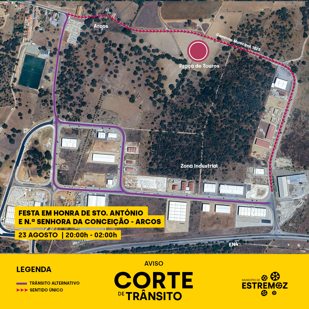- No referido caminho, entre as 20:00 horas do dia 23 de agosto e as 02:00 horas do dia 24 de agosto, no troço entre o entroncamento com o cemitério e o entroncamento com a via da zona industrial (SICA), em Arcos, o trânsito será efetuado apenas no sentido da EN4, conforme imagem ilustrativa.