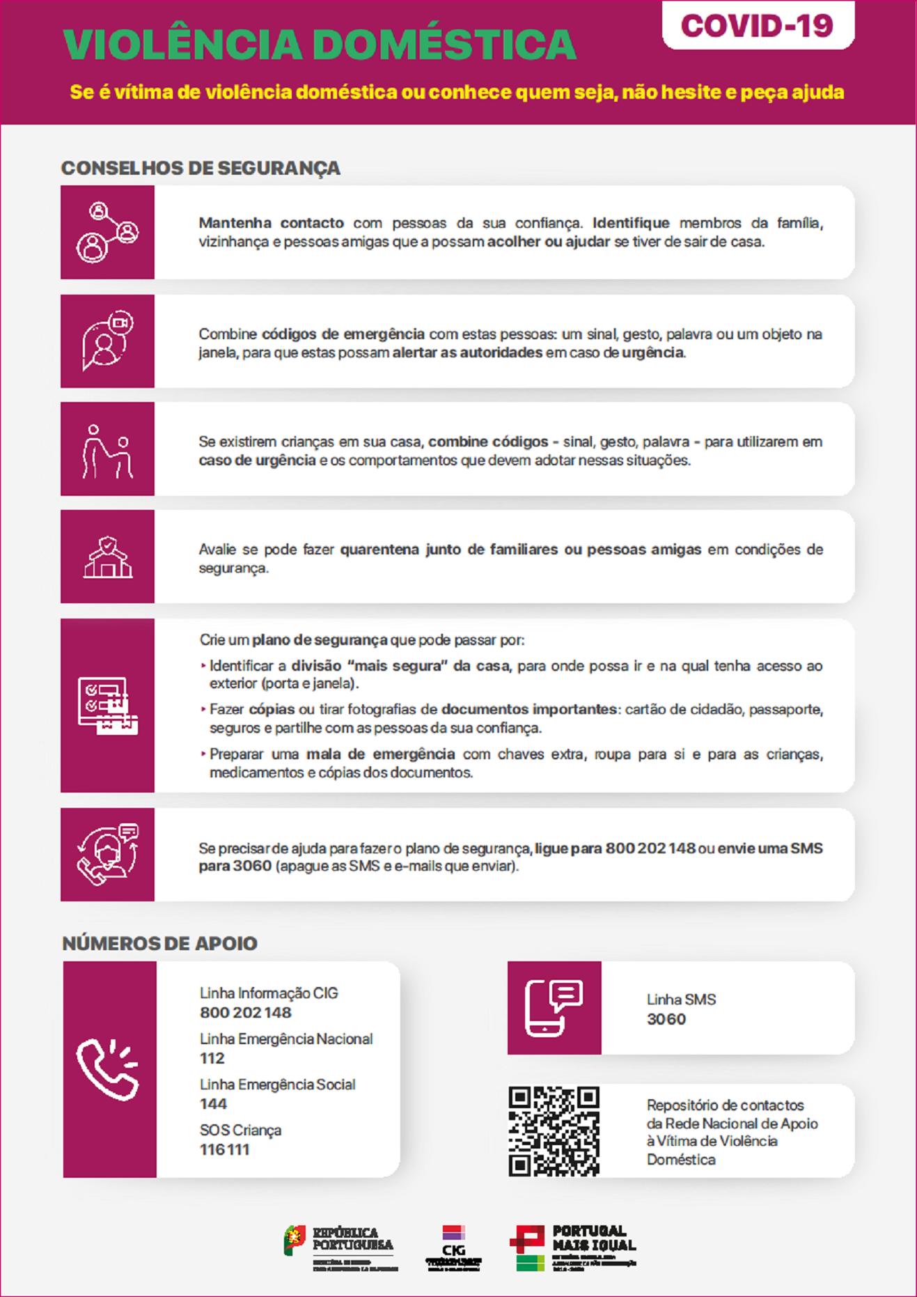- Crie um plano de segurança que pode passar por: Identificar a divisão "mais segura" da casa, para onde possa ir e na qual tenha acesso ao exterior (porta e janela), fazer cópias ou tirar fotografias de documentos importantes: cartão de cidadão, passaporte, seguros e partilhe com as pessoas da sua confiança e preparar uma mala de emergência com chaves extra, roupa para si e para as suas crianças, medicamentos e cópias dos documentos.