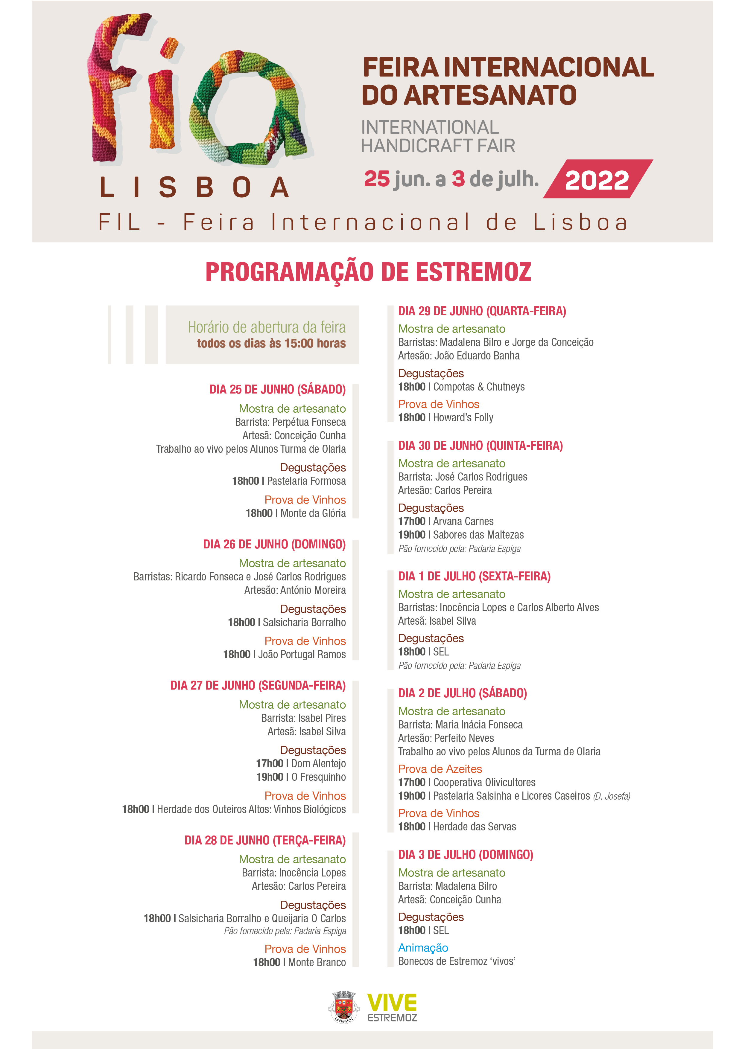 Sublinhamos a participação do Município de Estremoz na FIA 2022 - Feira Internacional do Artesanato 2022, na FIL, de 25 de junho a 3 de julho, um certame que decorre há mais de três décadas e que enlaça as tradições, a cultura e as histórias em forma de artesanato e gastronomia.