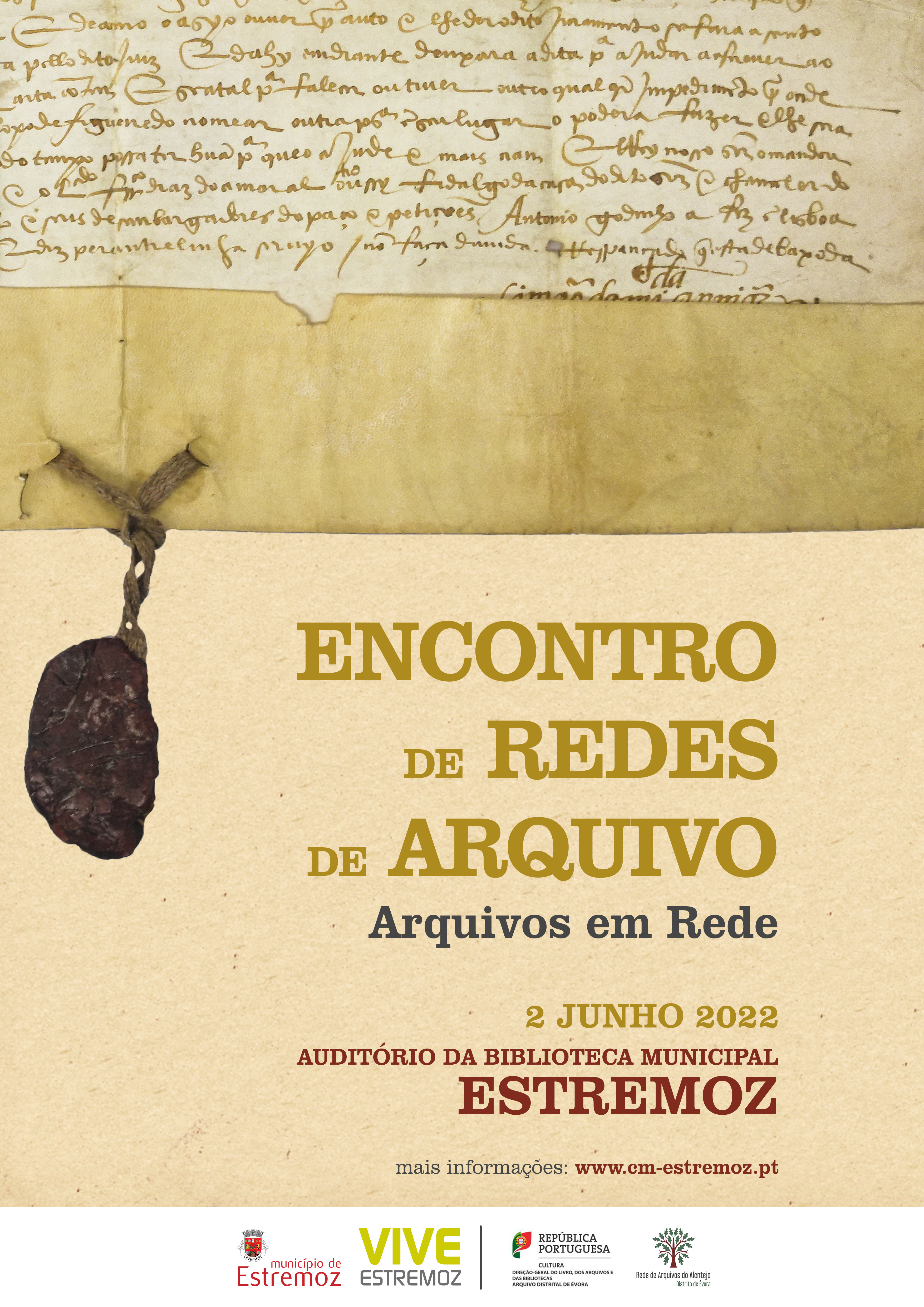 O Encontro de Redes de Arquivo, a realizar a Estremoz, decorrerá dia 2 de junho, no auditório da Biblioteca Municipal de Estremoz, sob o lema “Arquivos em Rede” e é organizado pelo Município de Estremoz com o apoio do Arquivo Distrital de Évora e da Rede de Arquivos do Alentejo - Distrito de Évora (RAA-DE).