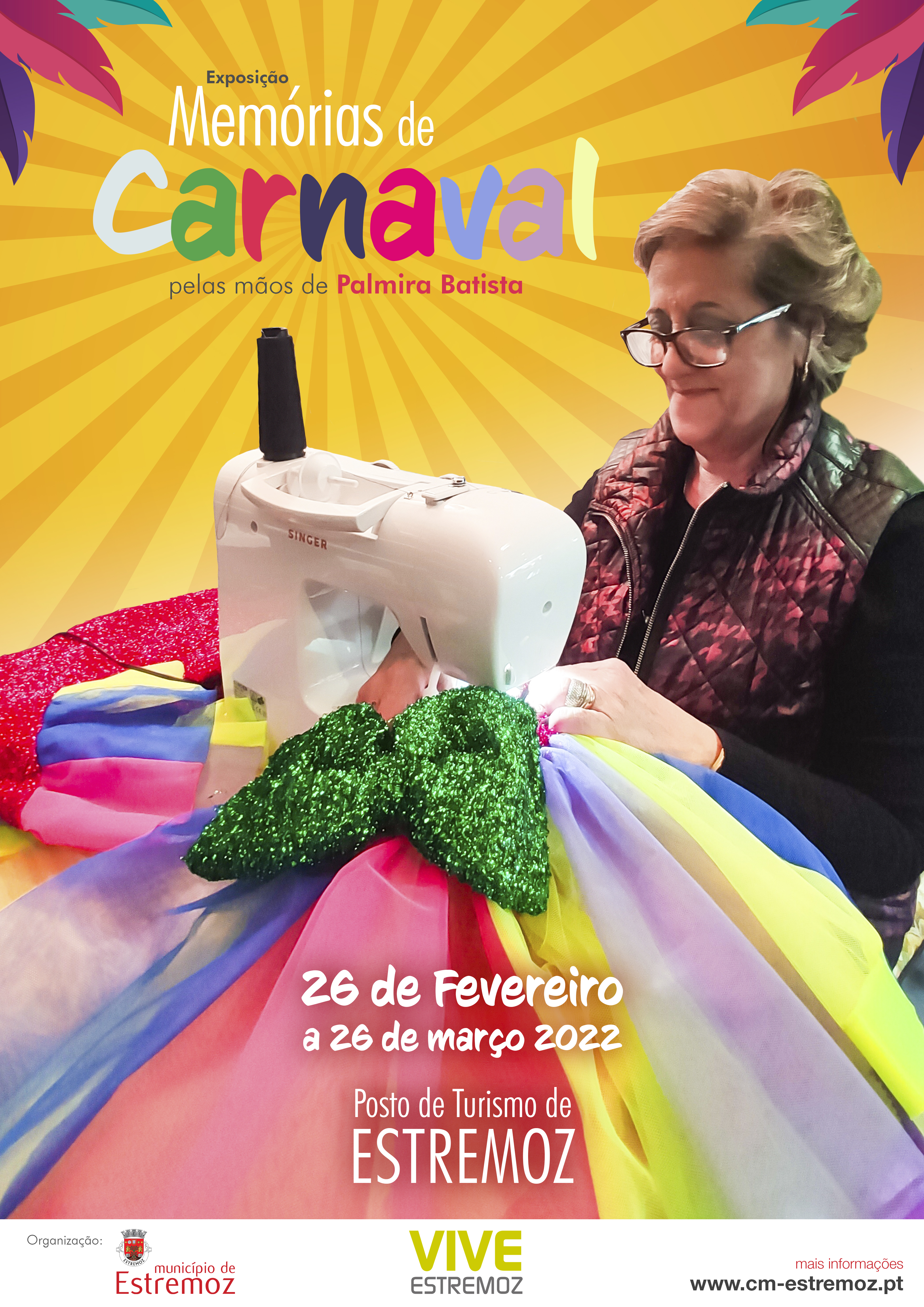 O Posto de Turismo de Estremoz vai exibir, de 26 de fevereiro a 26 de março, com inauguração pelas 16:00 horas, a exposição "Memórias de Carnaval", pelas mãos de Palmira Batista, a costureira que criou dezenas de fatos de Carnaval que brilharam nos corsos carnavalescos em Estremoz.