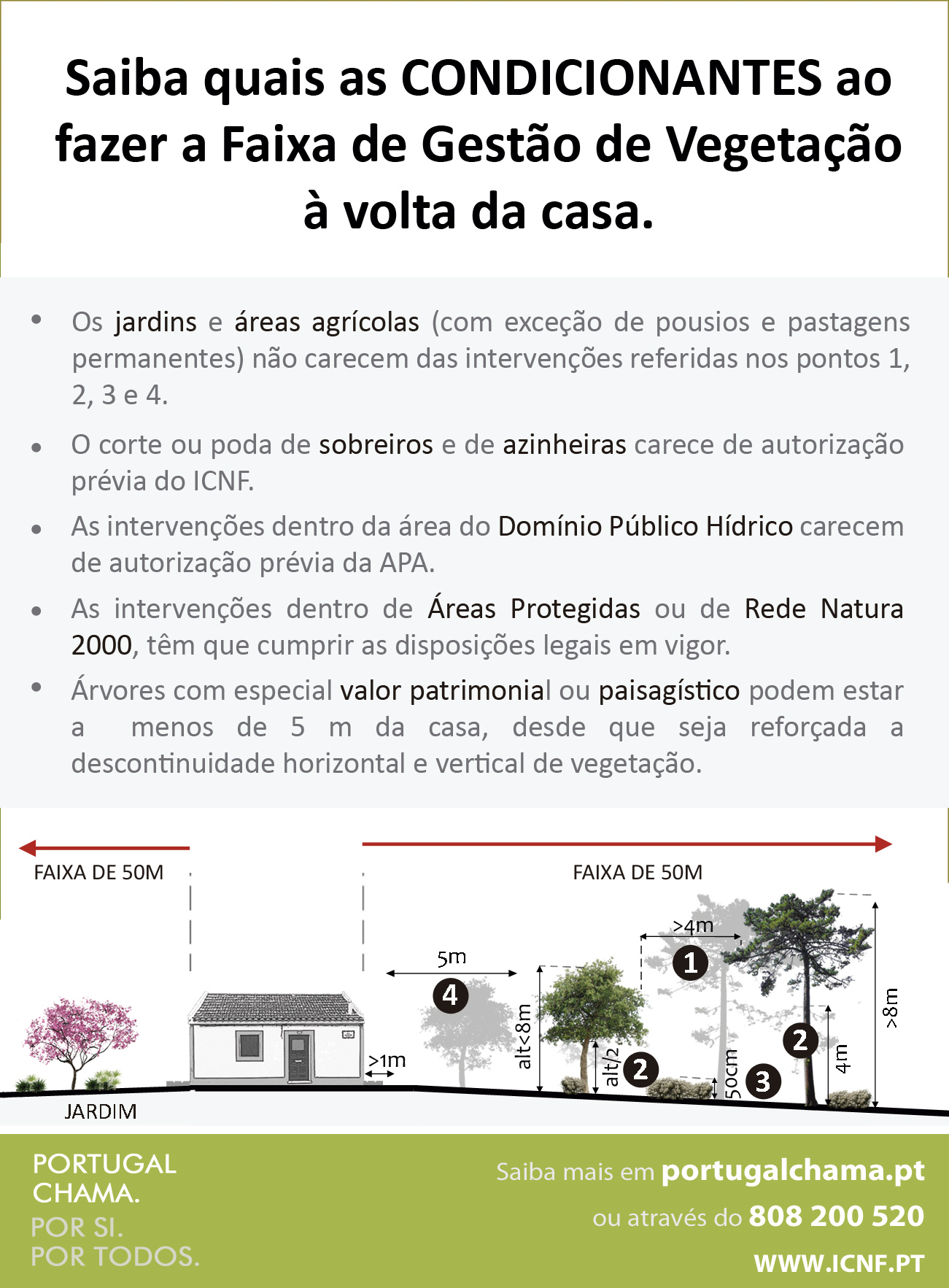 Esta faixa de gestão de combustível é a melhor proteção de pessoas e bens em caso de incêndio. Eliminando material inflamável à volta da sua casa, cria um espaço de segurança e reduz as hipóteses de um incêndio florestal atingir a sua habitação. Portugal sem fogos depende de todos. É, por isso, imperioso seguir estas regras.