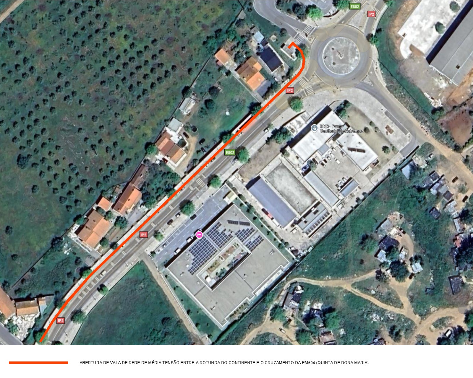 Os trabalhos, neste 1.º troço, consistem na abertura de vala e passagem de cabos no estacionamento junto ao IP2, entre a Rotunda do Continente e o cruzamento com a EM504 (Quinta de Dona Maria), conforme imagem.