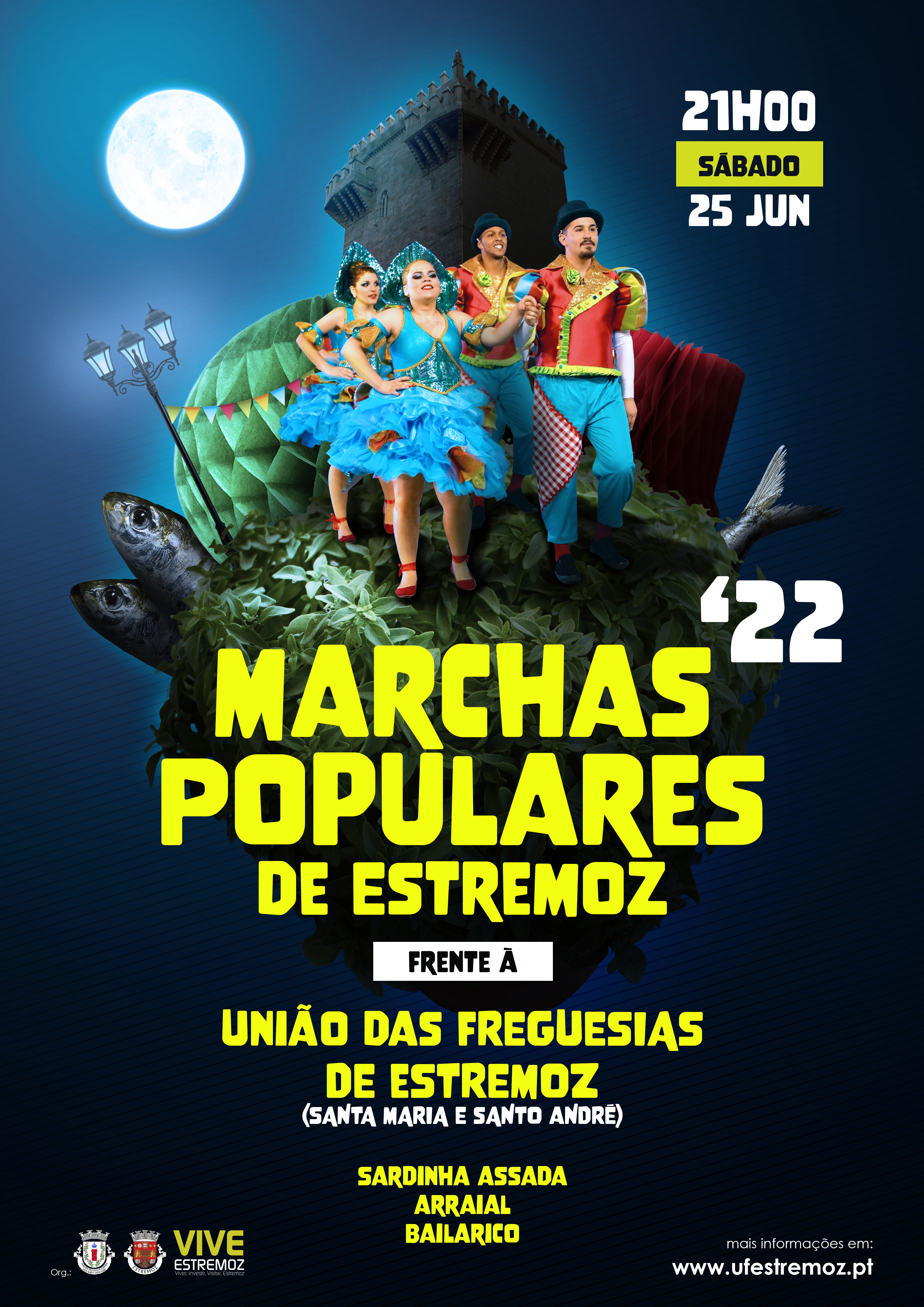 As Marchas Populares de Estremoz vão voltar a animar a cidade com um arraial, com sardinha assada e bailarico, na noite de sábado, dia 25 de junho, pelas 21:00 horas, em frente à sede da União das Freguesias de Estremoz (Santa Maria e Santo André), organizadora do evento.