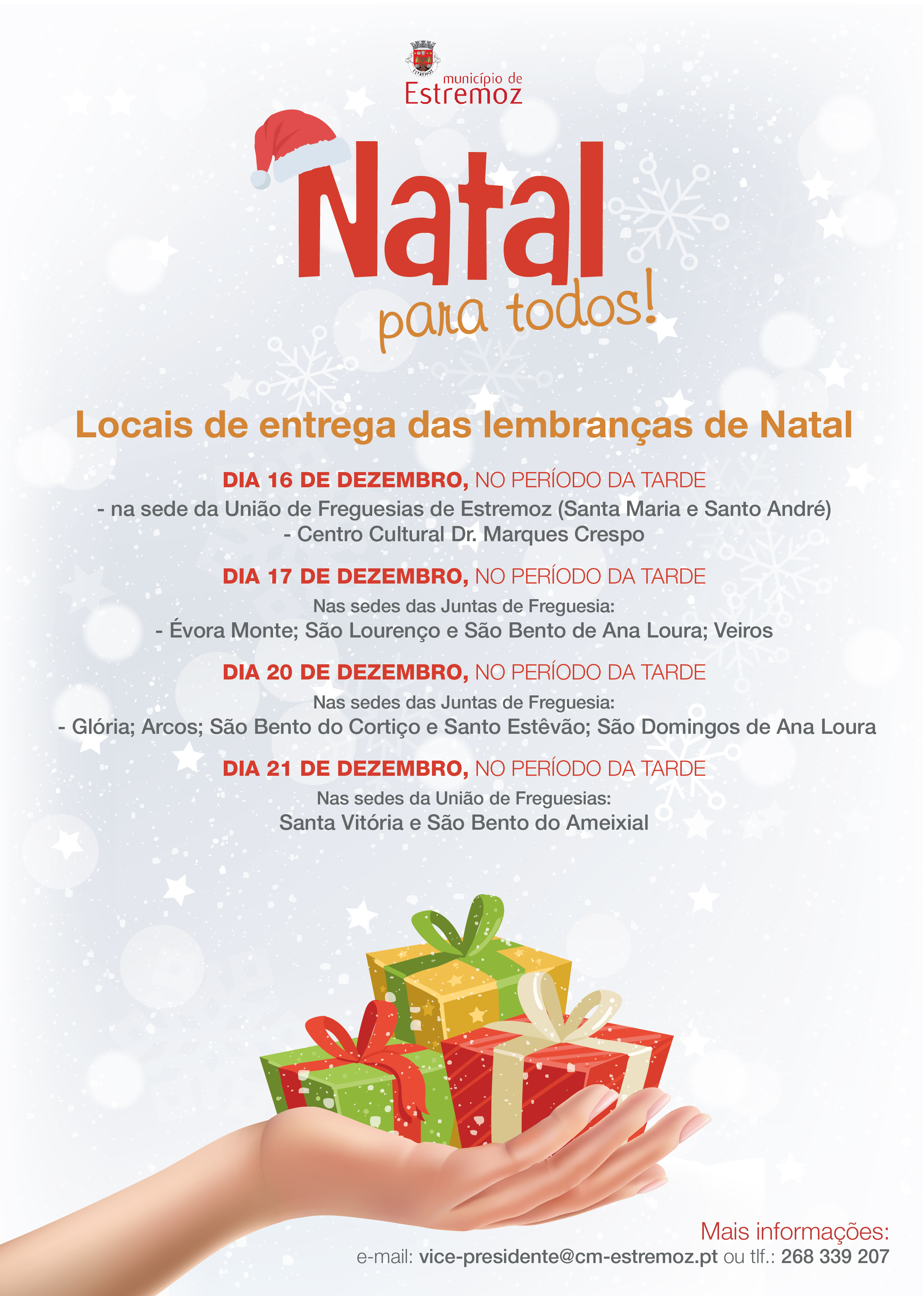 A Câmara Municipal de Estremoz não quis deixar de marcar o simbolismo da época natalícia e vai oferecer às famílias do concelho, que tenham um membro com idade igual ou superior a 65 anos, uma pequena lembrança de Natal, que após a inscrição vão ser entregues nos seguintes locais e horários: