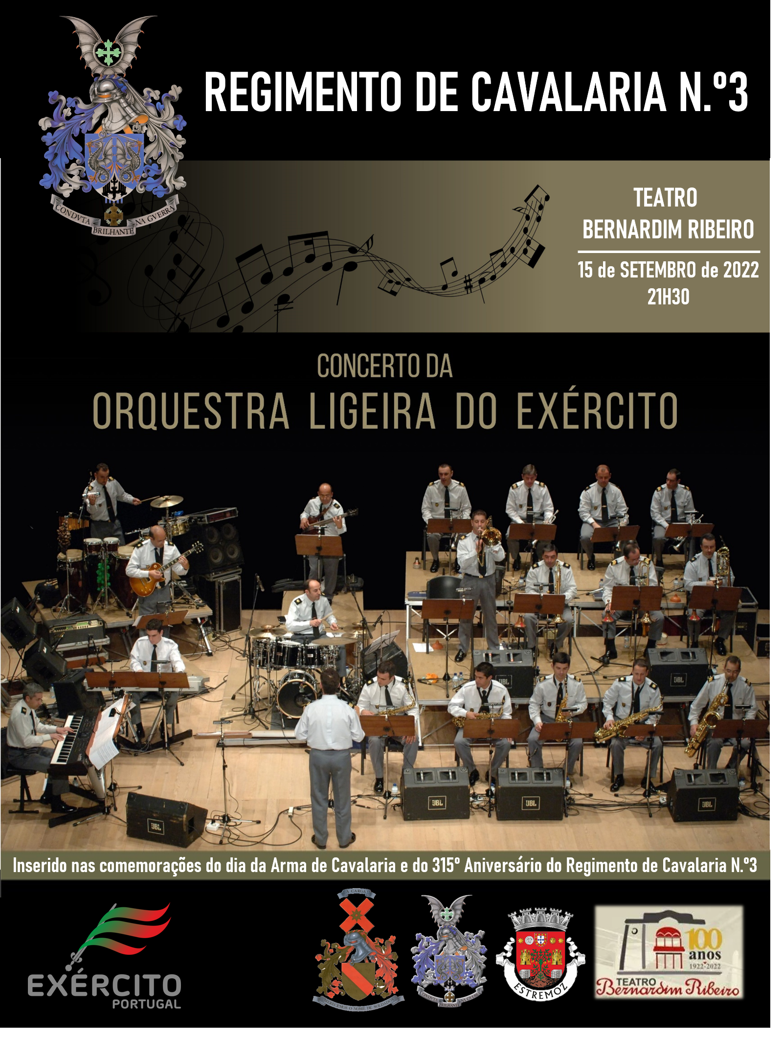Na noite de dia 15 de setembro, pelas 21:30 horas, o Teatro Bernardim Ribeiro receberá a Orquestra Ligeira do Exército para o concerto comemorativo do Dia da Arma de Cavalaria e do 315º Aniversário do Regimento de Cavalaria nº3. .