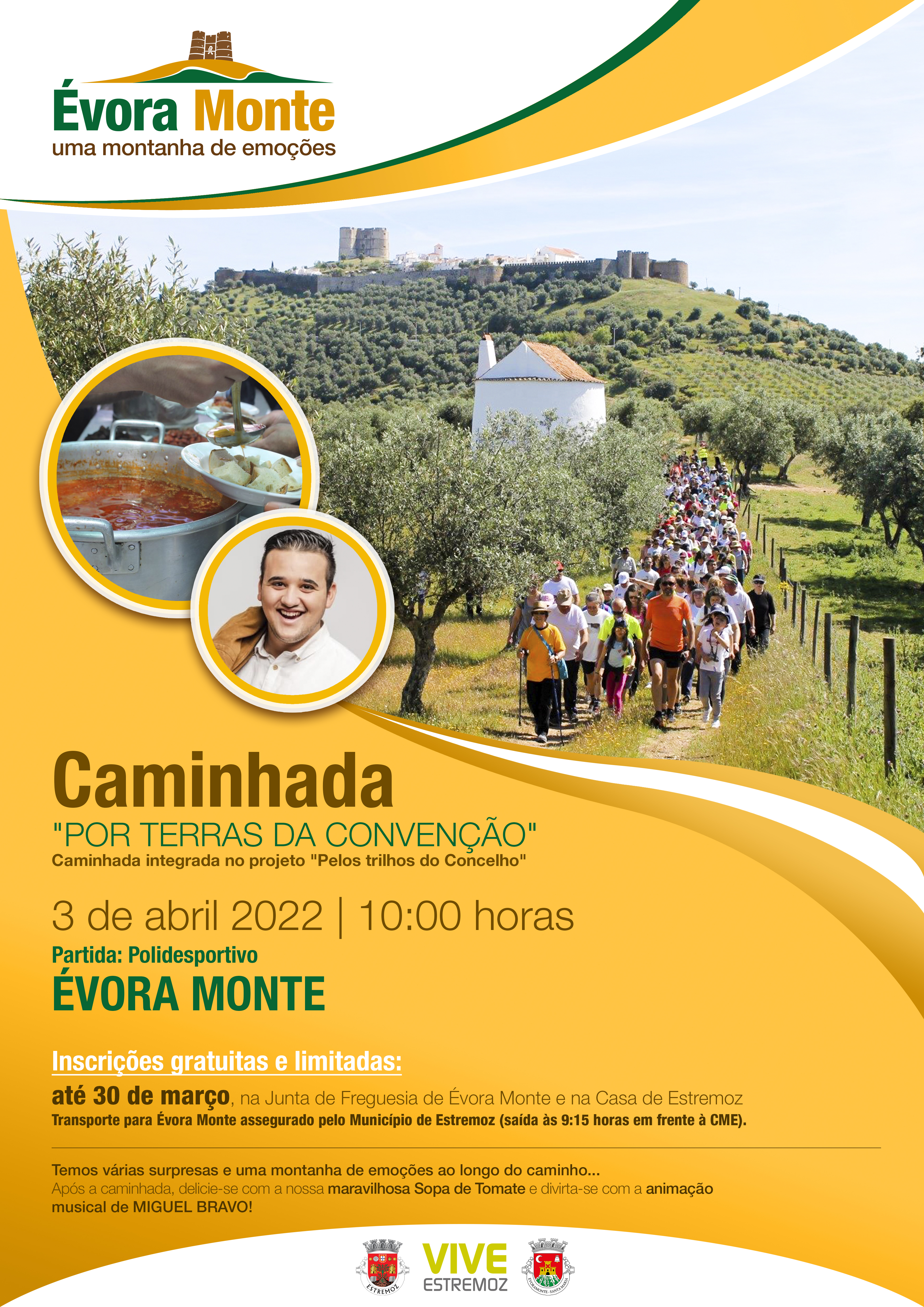 A 3 de abril de 2022, pelas 10:00 horas, em Évora Monte "Por Terras da Convenção", vai realizar-se a primeira caminhada do Projeto "Pelos Trilhos do Concelho".